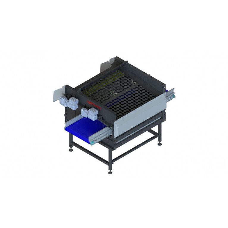 Продукт подается через загрузочный лоток. Двойное толкающее устройство распределяет продукт по всей поверхности сита и аккуратно поворачивает его для сортировки. Перед передаточным валиком продукт поднимается из ячеек сита с помощью резиновых звездочек и по прорезиненному желобу попадает на следующее сито или разгрузочный конвейер.