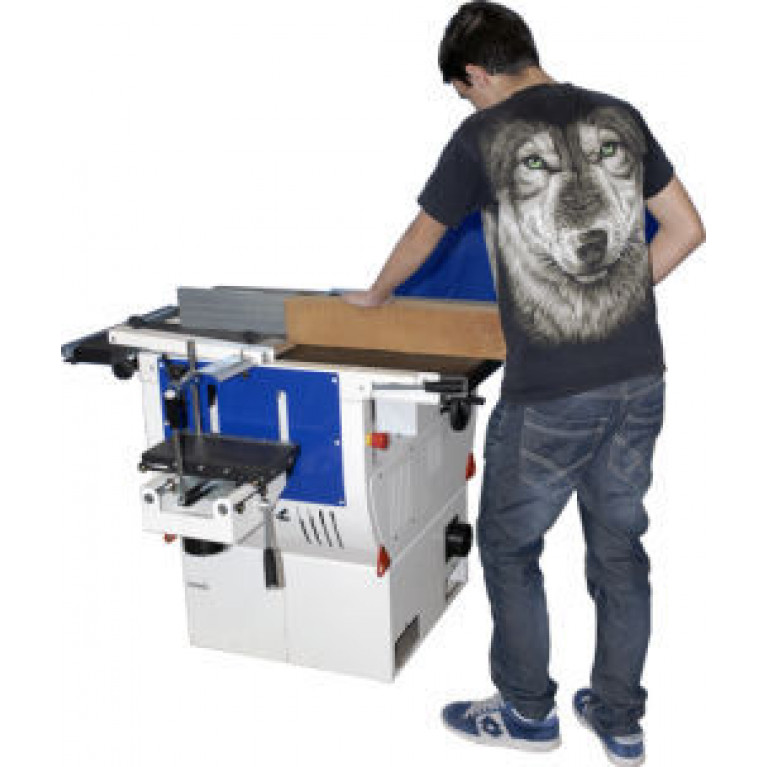 Станок оснащен 4 основными функциями: наклонная циркулярная пила, строгальный станок, строгальный станок по толщине, фрезерный шпиндельный станок.