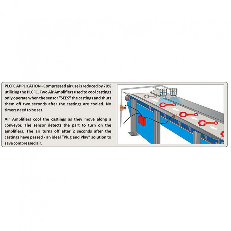 Система управления на ПЛК с удобным интерфейсом от Nex Flow™ (PLCFC) для сжатого воздуха является действительно продвинутым комплексом, в ней задействованы самые современные технологии, и она может применяться как отдельно, так и в составе других систем автоматизации. Система PLCFC построена на ПЛК – это не просто таймер. Система PLCFC снабжена фотоэлектрическими датчиками, и включает подачу воздуха когда цель проходит около датчика, выключает воздух когда цель ушла. (Прибор настроен на задержку в 2 секунды после прохождения цели, но включает воздух мгновенно при появлении цели перед датчиком). Мы можем также поставить дополнительный таймер, если заказчику требуется выключение по времени, а не по срабатыванию датчика.