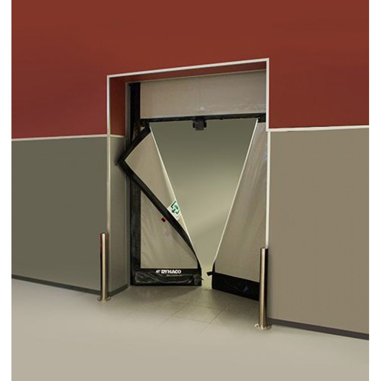 Гибкая ПВХ-завеса ворот Dynaco D-313 Emergency имеет оригинальный Т-образный разрез посередине. Когда человек нажимает на указанные точки разблокировки, завеса разделяется на две симметричные створки и открывается аварийный выход.